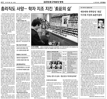 김준엽 전 총장의 부고를 보면 그가 일제강점기 광복군으로 독립운동에 헌신했다는 사실, 수차례 관직을 제안받았지만 학문에만 전념한 지조 있는 지성인이었다는 점, 독재정권의 탄압과 간섭에 맞서다 고려대 총장직에서 물러나야 했던 사정 등 그의 꼿꼿한 삶을 돌아볼 수 있습니다. 기사를 읽다 보면 김 전 총장이 어려움을 겪었던 순간엔 안타까움이 느껴지고, 이런 난관을 이겨내면서 업적을 이루었을 때는 감동을 느낍니다. 그러면서 강인한 지조와 겸허한 모습에 닮고 싶은 마음을 갖게 됩니다.