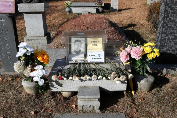 전태일 50주기를 앞둔 11일 경기도 남양주시 모란공원 전태일 열사 묘역에서 추모화가 가지런히 놓여 있다.