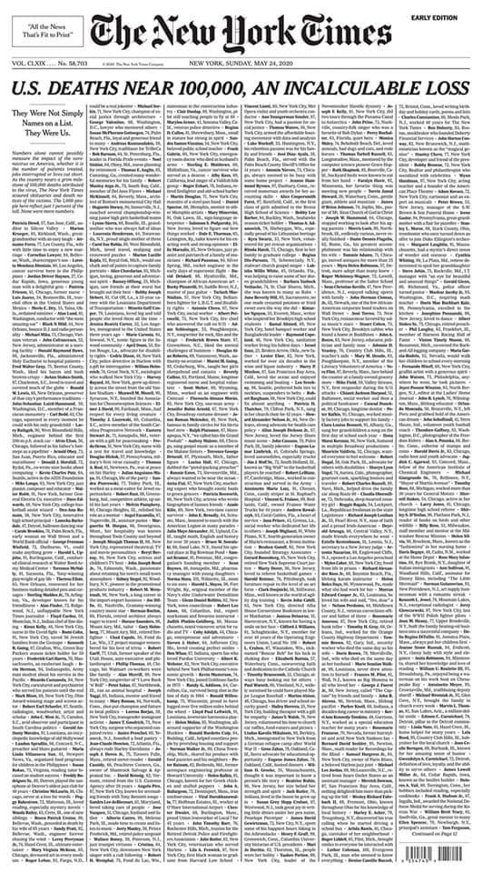 3· ‘10만 명의 죽음... 헤아릴 수 없는 손실’: “미국은 코로나 발병의 끔찍한 이정표에 도달했다. 각 수치는 지금까지 잃어버린 100000명의 생명 중 하나를 나타낸다. 그러나 그 하나하나는 너무나 많은 것을 보여준다.” 지난 5월 24일(일요판) 뉴욕타임스가 1면에 게재한 전면 사망기사다.