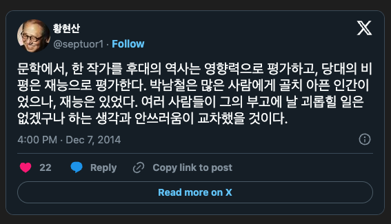 문학에서, 한 작가를 후대의 역사는 영향력으로 평가하고, 당대의 비평은 재능으로 평가한다. 박남철은 많은 사람에게 골치 아픈 인간이었으나, 재능은 있었다. 여러 사람이 그의 부고에 날 괴롭힐 일은 없겠구나 하는 생각과 안쓰러움이 교차했을 것이다.