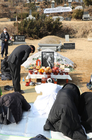 21일 오전 경기도 남양주시 모란공원에서 열린 고 백기완 통일문제연구소장 삼우제에서 유족들이 절을 하고 있다.
