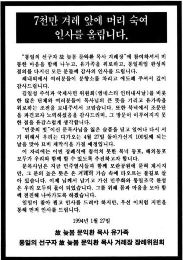 "민중의 벗"이신 문목사님을 잃은 슬픔을 딛고 일어나 다시 서기 위해서 우리는 다가오는 4월 27일 돌아가신 지 100일 되는 날을 맞아 묘비 제막식을 가질 예정입니다. 이 자리에는 이번 장례식에 참석치 못한 북녘 동포, 해외동포 모두가 우리와 함께 할 수 있도록 추진하고자 합니다. 문목사님은 지금 민주열사와 함께 모란공원에 묻혀 계시지만, 그분의 높은 뜻은 온겨레의 가슴속에 타오르는 불길로 살아있습니다. 이제 님께서 남기고 가신 민주화와 통일 조국 완성은 우리 모두의 몫이 되었습니다. 그를 위해 몸과 마음을 모아 함께 전진해 나아가도록 하겠습니다. 일일이 찾아뵙고 인사를 드려야 하지만, 우선 이처럼 지면을 통해 먼저 인사를 드립니다.