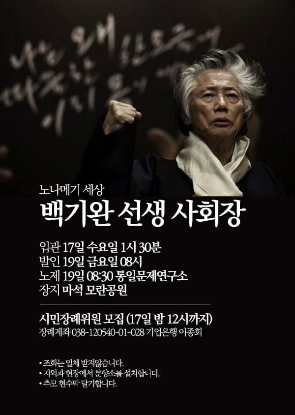 백기완 선생님, 고마웠습니다. 이 풍진 세상 고통 내려놓으시고 편안한 저 세상에서 영면을 취하소서.