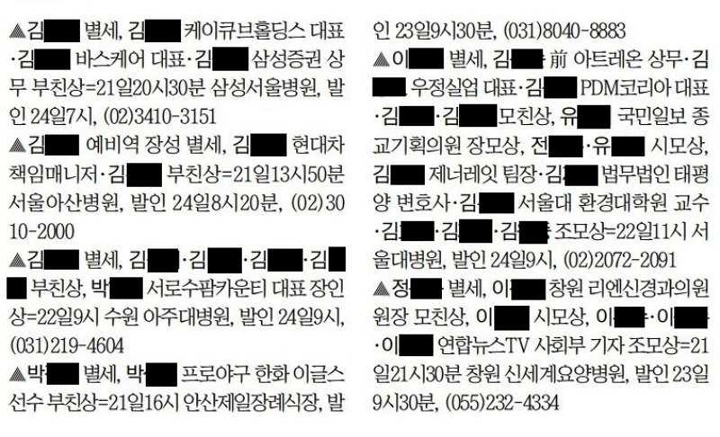한국식 죽음 - 김승희김금동씨(서울 지방검찰청 검사장), 김금수씨(서울 초대병원 병원장), 김금남씨(새한일보 정치부 차장) 부친상, 박영수씨(오성물산 상무이사) 빙부상, 김금연씨(세화여대 가